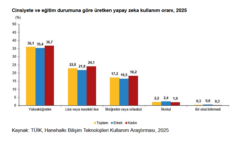 Yapay zeka kullanan bireyler eğitim durumuna göre incelendiğinde; 2025 yılında yapay zeka kullanma oranının en fazla yüzde 36,1 ile yükseköğretim mezunlarında olduğu belirlendi. Bunu, yüzde 22,8 ile lise veya mesleki lise mezunu, yüzde 17,2 ile ilköğretim veya ortaokul mezunu, yüzde 2,2 ilkokul mezunu bireyler takip etti. Bu oran cinsiyete göre incelendiğinde ise, ilkokul mezunları ve bir okul bitirmeyenler arasında erkeklerin kadınlara göre daha yüksek oranda yapay zeka kullandığı, ilköğretim veya ortaokul, lise veya mesleki lise ile yükseköğretim mezunlarında kadınların kullanım oranının erkeklerin üzerinde olduğu görüldü.