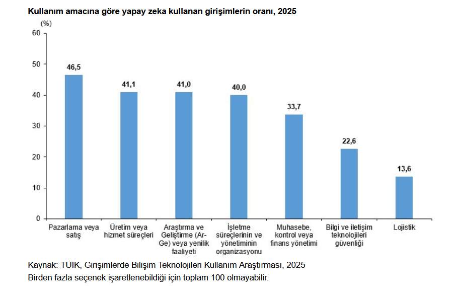 Yapay zeka teknolojilerinden herhangi birini kullandığını belirten girişimlerin yapay zeka kullanma amaçları incelendiğinde; 2025 yılında girişimlerin en fazla yüzde 46,5 ile pazarlama veya satış amacıyla yapay zeka yazılım veya sistemlerini kullandığı tespit edildi. Bunu, yüzde 41,1 ile üretim veya hizmet süreçleri amacıyla kullanım, yüzde 41,0 ile Araştırma ve Geliştirme (Ar-Ge) veya yenilik faaliyeti amacıyla kullanım ve yüzde 40,0 ile işletme süreçleri ve yönetim organizasyonu amacıyla kullanım takip etti. Muhasebe, kontrol veya finans yönetimi amacıyla yapay zeka kullanımı yüzde 33,7, bilgi ve iletişim teknolojileri güvenliği amacıyla yapay zeka kullanımı yüzde 22,6, lojistik faaliyetler amacıyla yapay zeka kullanımı ise yüzde 13,6 oldu.