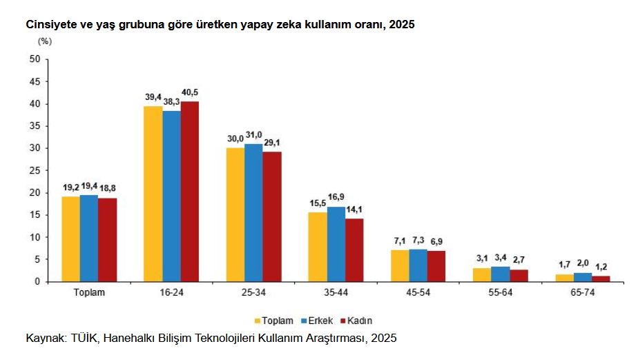 Üretken yapay zeka kullandığını beyan eden bireylerin oranı 2025 yılında yüzde 19,2 oldu. Bu oran, cinsiyete göre incelendiğinde erkeklerin yüzde 19,4'ünün kadınların yüzde 18,8'inin yapay zeka kullandığı görüldü. Yapay zeka kullanma oranı yaş grubuna göre analiz edildiğinde ise, en fazla yüzde 39,4 ile 16-24 yaş grubunda yer alan bireylerin yapay zeka kullandığı, bunu yüzde 30,0 ile 25-34 yaş grubunun, yüzde 15,5 ile 35-44 yaş grubunun takip ettiği saptandı. Yapay zeka kullanım oranının en düşük olduğu yaş grubu ise 65-74 yaş grubunda oldu.