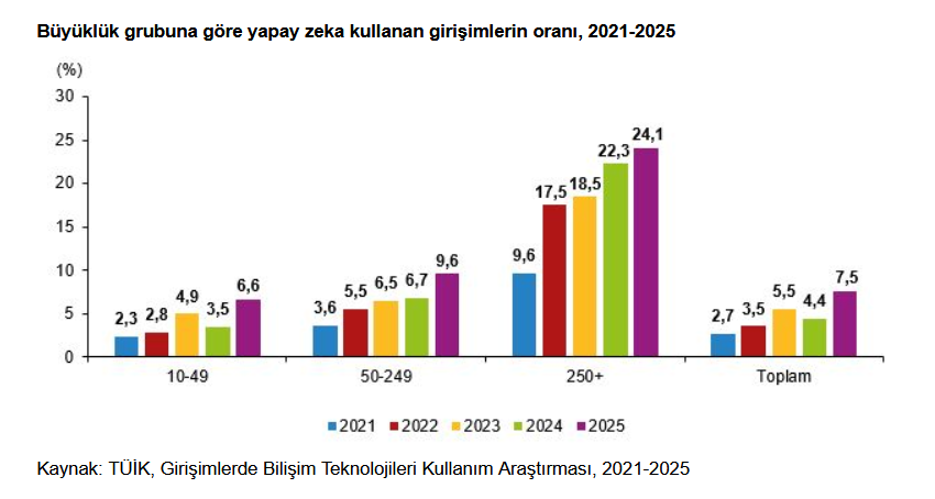 Türkiye İstatistik Kurumu’nun (TÜİK) verilerine göre, yapay zeka teknolojilerinden herhangi birini kullandığını belirten girişimlerin oranı, 2021 yılında yüzde 2,7 iken bu oran 2025 yılında yüzde 7,5 oldu. Yapay zeka kullanan girişimler çalışan sayısı büyüklük grubuna göre incelendiğinde; 2025 yılında 10-49 çalışanı olan girişimlerin yüzde 6,6'sının, 50-249 çalışanı olan girişimlerin yüzde 9,6'sının ve 250 ve üzeri çalışanı olan girişimlerin yüzde 24,1'inin herhangi bir yapay zeka teknolojisi kullandığı görüldü. Bu oranlar, 2021 yılında 10-49 çalışanı olan girişimlerde yüzde 2,3, 50-249 çalışanı olan girişimlerde yüzde 3,6 ve 250 ve üzeri çalışanı olan girişimlerde yüzde 9,6 idi.