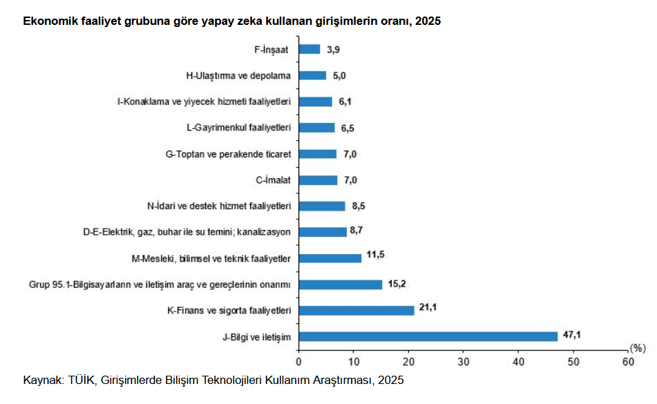 Yapay zeka teknolojilerinden herhangi birini kullandığını belirten girişimler ekonomik faaliyet grubuna göre incelendiğinde; yapay zekanın en fazla yüzde 47,1 ile "bilgi ve iletişim" faaliyeti yürüten girişimler tarafından kullanıldığı görüldü. Bu ekonomik faaliyet grubunu yüzde 21,1 ile "finans ve sigorta" faaliyeti yürüten girişimler ve yüzde 15,2 ile "bilgisayarların ve iletişim araç ve gereçlerinin onarımı" faaliyetini yürüten girişimler izledi.