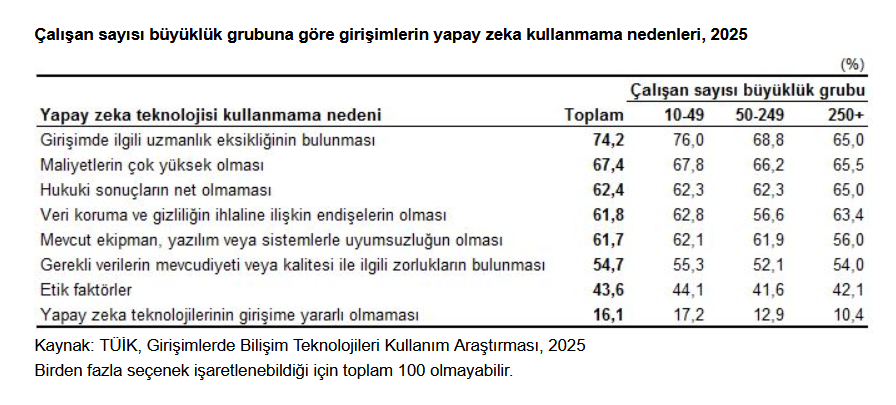 Yapay zeka teknolojilerinden herhangi birini kullanmadığını ancak kullanmayı düşündüğünü belirten girişimlerin yapay zekayı kullanmama nedenleri incelendiğinde; en önemli nedenin yüzde 74,2 ile girişimde ilgili uzmanlık eksiğinin bulunması olduğu görüldü. Bunu, yüzde 67,4 ile maliyetlerin çok yüksek olması ve yüzde 62,4 ile yapay zeka kullanımından kaynaklanan zarar durumunda sorumluluğun kimde olacağına dair hukuki belirsizlikler gibi hukuki sonuçların net olmaması izledi.