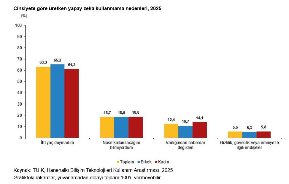 Yapay zeka kullanmadığını beyan eden bireylerin kullanmama nedenleri incelendiğinde; en yüksek oranın yüzde 63,3 ile yapay zekaya ihtiyaç duymama gerekçesinin olduğu görüldü. Bunu, yüzde 18,7 ile yapay zekanın nasıl kullanılacağını bilmemek, yüzde 12,4 ile yapay zekanın varlığından haberdar olmamak ve yüzde 5,5 ile gizlilik, güvenlik veya emniyetle ile ilgili endişeleri izledi.